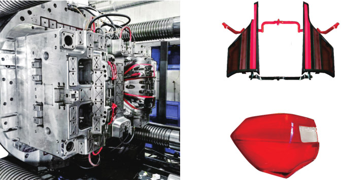 射出部分有兩組獨(dú)立之料管組,同步做射出動(dòng)作,雙色一次成型,可大幅縮短成型周期,增加經(jīng)營利潤。
